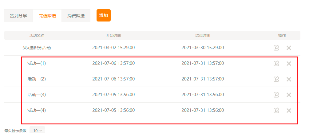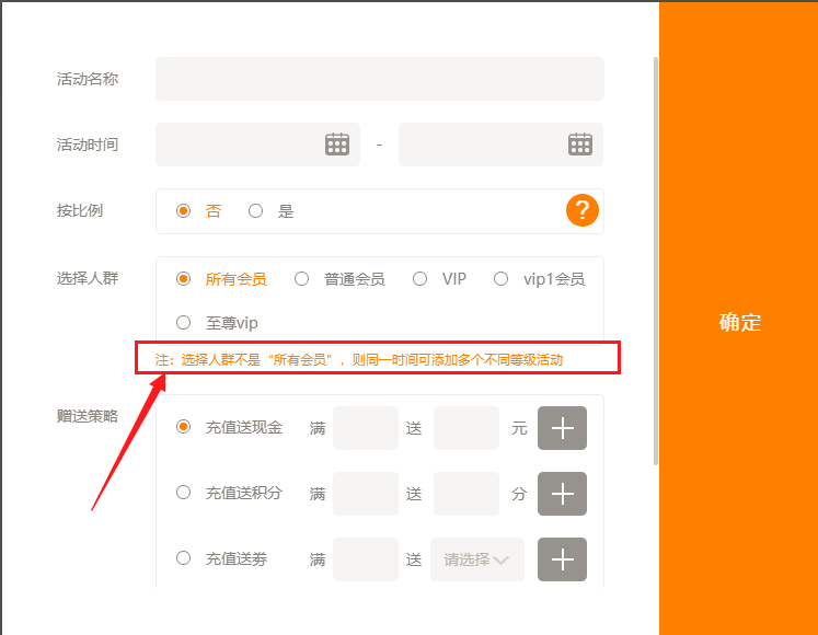 注意:同一会员等级中,充值赠送多个活动时间段不能重复!可以为不同的会员等级添加不同的活动规则。
