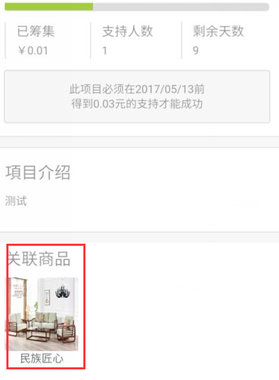 关联商品 设置后显示在从筹的页面最下方,点击产品用户可以打开显示对应的产品详情